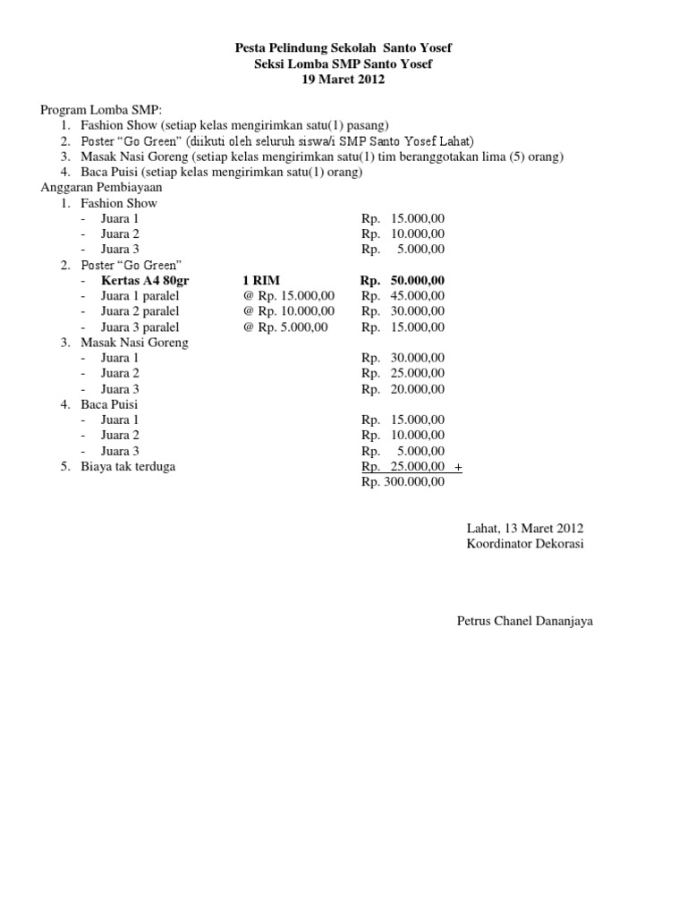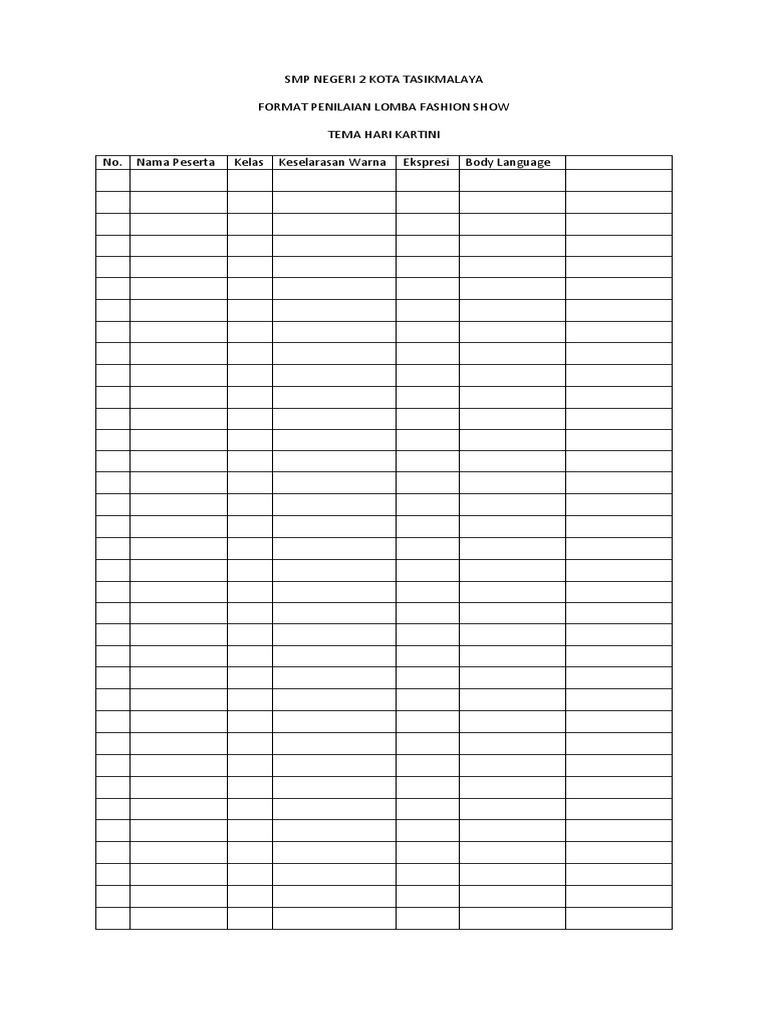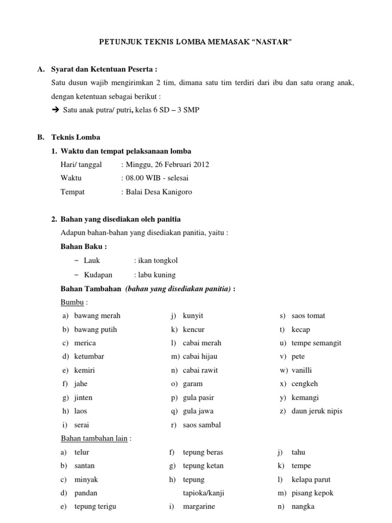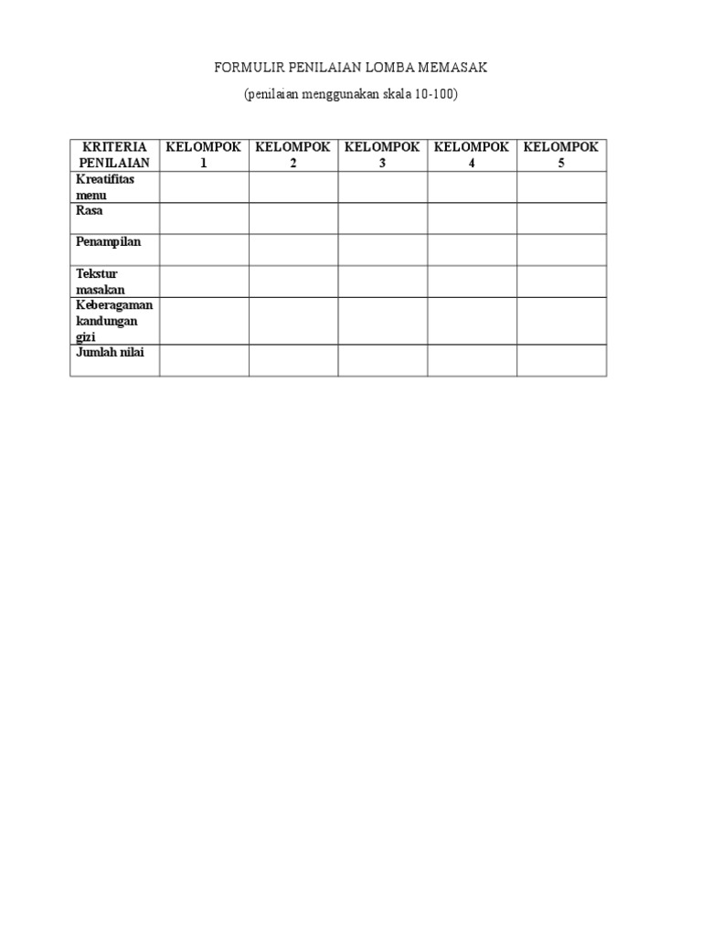 Deskripsi dibuat dengan format penulisan sebagai berikut: Intermonev community ii gizi kesehatan fakultas kedokteran universitas brawijaya form penilaian lomba masak kriteria tim 1 tim 2 tim 3 tim 4 tim 5 tim 6 kreatifitas cita rasa penampilan tekstur keragaman kandungan gizi presentasi total keterangan: Kertas ukuran a4, margin kiri 3, atas 2, kanan 2 dan bawah 2 c. Lomba masak nasi goreng peringatan hari ibu. Form penilaian lomba masak nasi goreng.